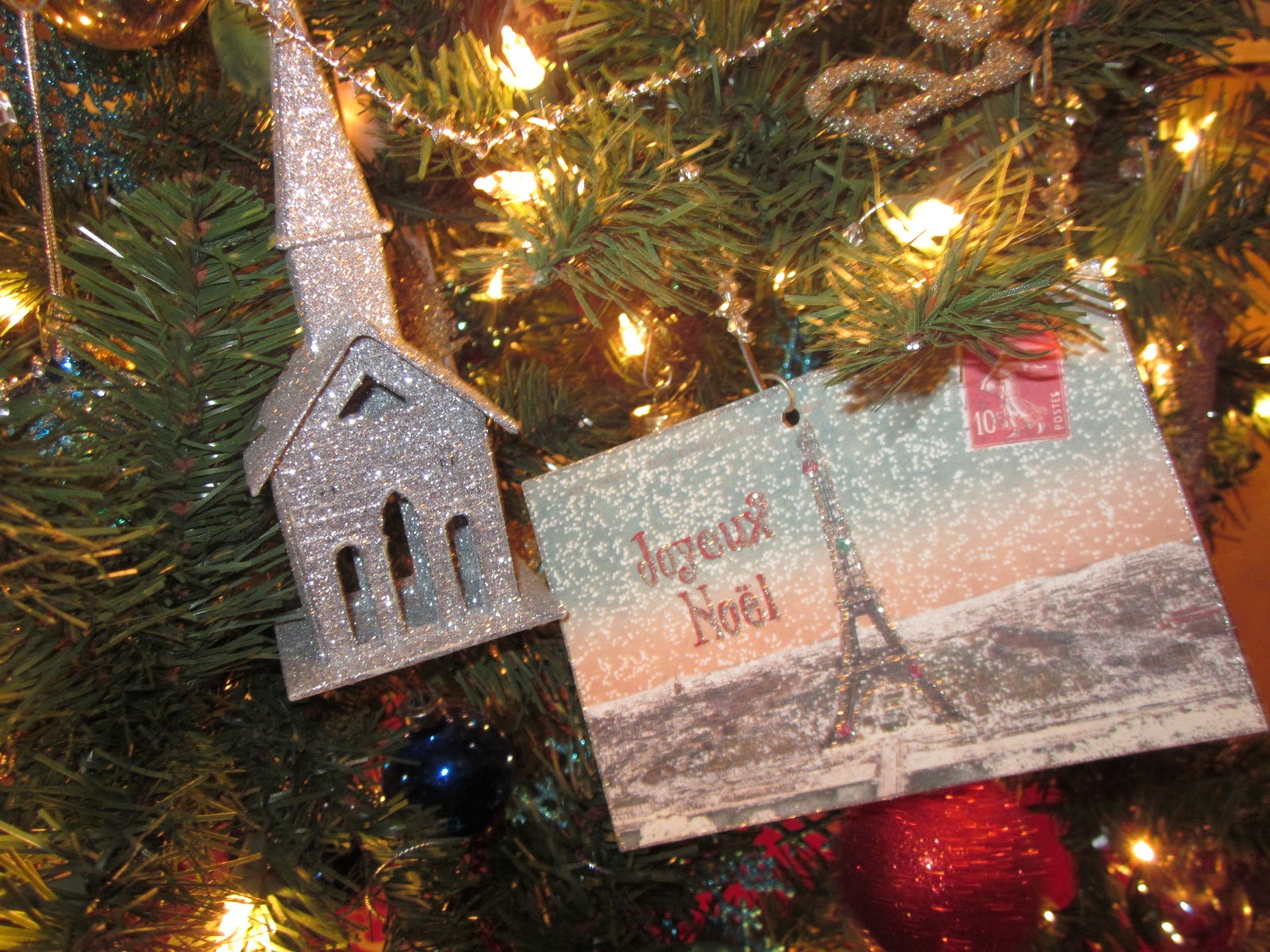 So Christmas is a big process around here....I love decorating and changing things around...every year is something a little different...my "norm" though is fun & bright using reds, greens, yellows...cutesy and kid friendly....but this year I just wanted a little bit of glam & sparkle so I did my family room in a more elegant style....I bought everything last year on clearance....and I scored....I still added a bit of "fun & whimsy" by putting my little Annalee elf in the "glitzy glam" tree....I love how it turned out....I found french post cards and just popped a hole in the top and added a pretty little hook I found last year....that silver ornament with the satin ribbon and sparkle tree was only $2.50! And....I stopped by my Mom's yesterday and she gave me a bunch of beautiful ornaments that were my grandmothers and ornaments she'd bought years ago...all gorgeously elegant & vintage....again, SCORE! I still have the fun stuff in the other rooms and I'll show you those pictures another time....now off I go to sit on my cozy couch with a cup of hot chocolate, reading the newest "Martha Stewart" mag and to let myself be blinded dazzled by the bling!!....only 20 shopping days left until Christmas!